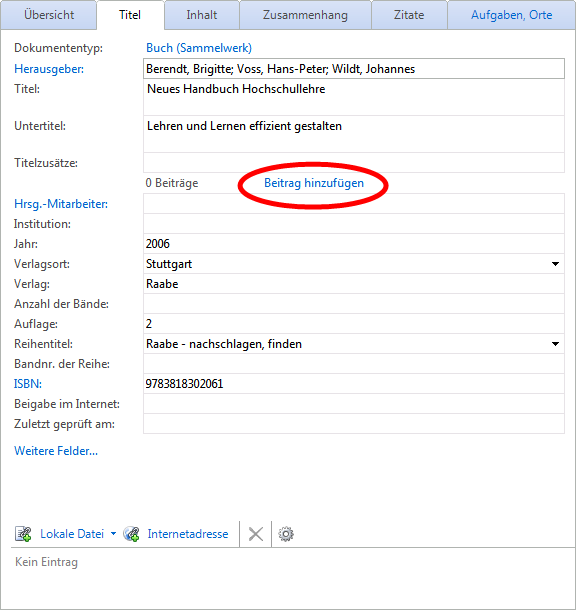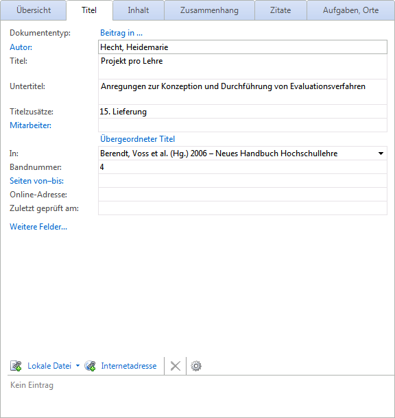 Loseblattsammlungen (oder -werke) sind in der Regel Sammlungen einzelner Beiträge, die periodisch ausgetauscht oder ergänzt werden. Das Grundwerk wird in Citavi als Buch (Sammelwerk) erfasst. Für alle einzelnen Beiträge und damit auch die Ergänzungslieferungen verwenden Sie den Dokumententyp Beitrag in.
