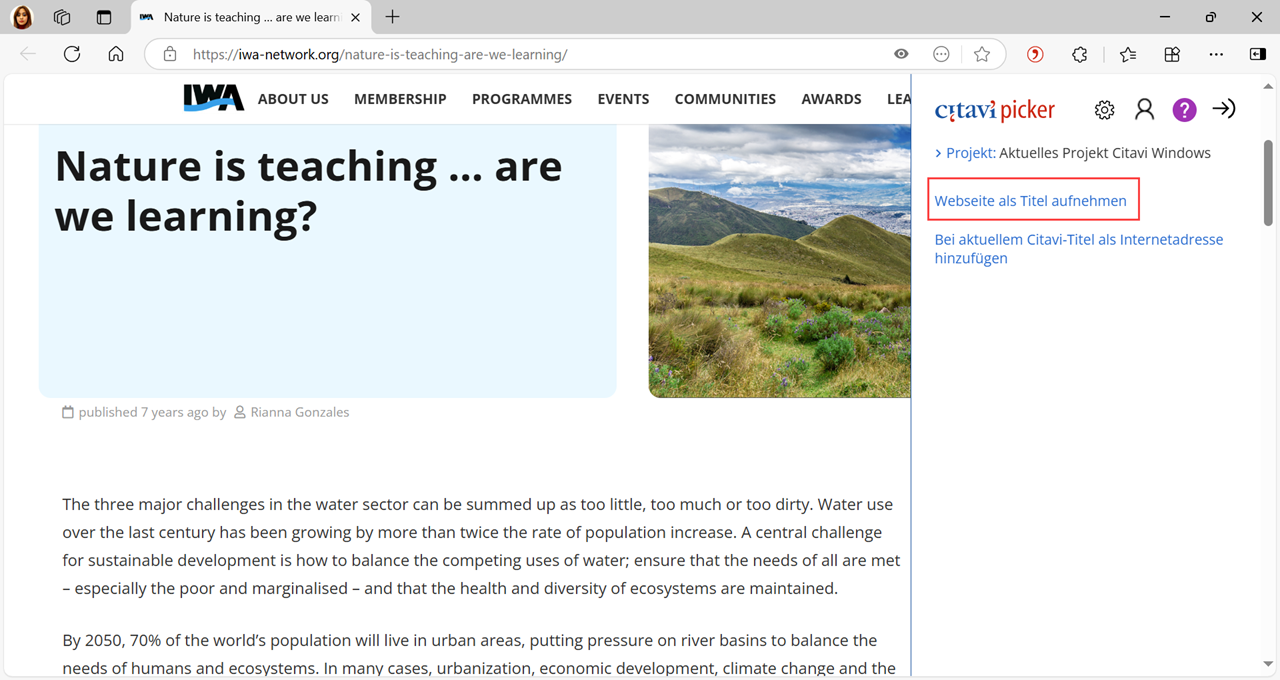 3 Der Picker wertet die Meta-Daten der Webseite aus und überträgt diese nach Citavi. Ergänzen Sie fehlende Angaben, insbesondere Autoren-Informationen, oder bei Blog-Artikeln das Datum der Veröffentlichung.