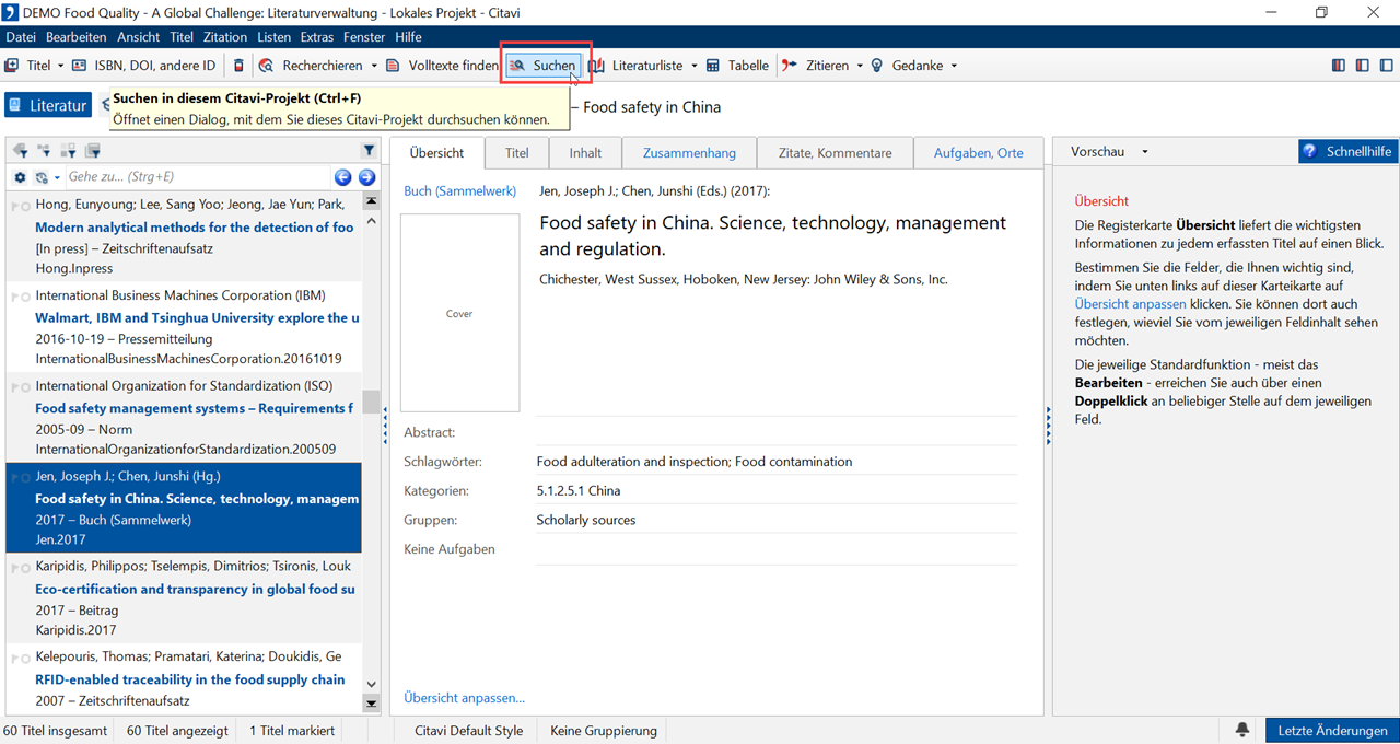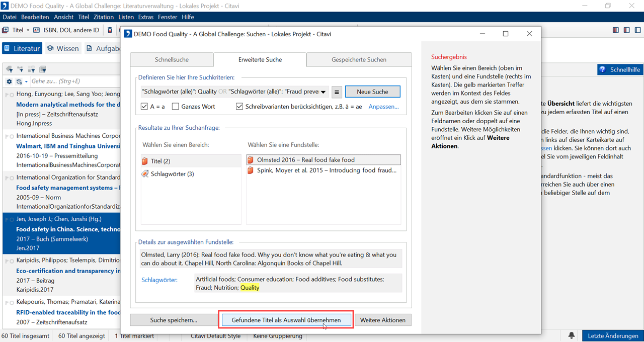 5 Citavi zeigt, in welchen Bereichen Ihr Suchbegriff gefunden wurde. Klicken Sie auf Gefundene Titel als Auswahl übernehmen, um nur die Treffer zu sehen.