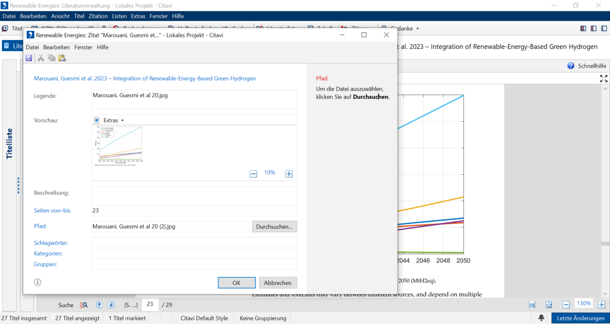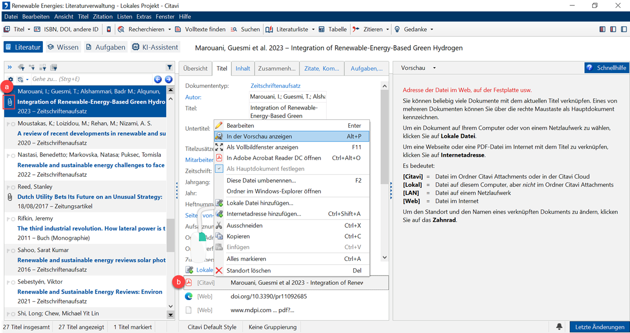 1 Öffnen Sie die verknüpfte Datei in der Citavi Vorschau. Klicken Sie dazu entweder auf das a Klammer-Symbol oder drücken Sie ALT+P oder klicken Sie mit der rechten Maustaste auf den b Dateinamen, wählen Sie aus dem Kontextmenü den Befehl In der Vorschau anzeigen.