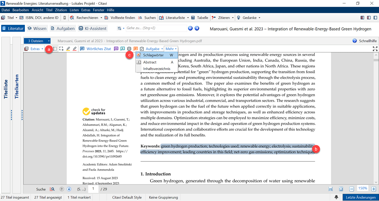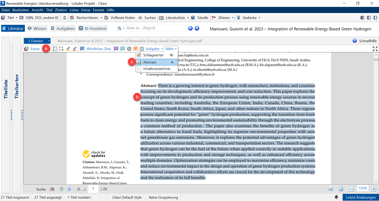 4 Möchten Sie das Abstract übernehmen? Markieren Sie mit dem a Textauswahl-Werkzeug den gewünschten b Text. Wählen Sie aus dem Menü Mehr den Befehl c Abstract.
