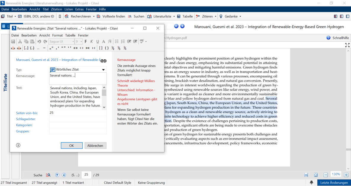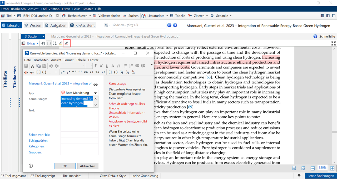 6 Nutzen Sie den roten Marker, um Textstellen hervorzuheben und zu der betreffenden Stelle eine Kernaussage zu speichern. Wenn die PDF-Datei es zulässt, ermittelt Citavi die Seitenzahl für das neue Wissenselement. Andernfalls tragen Sie die Seitenzahl von Hand ein. Weisen Sie dem Wissenselement bei Bedarf Schlagwörter, Kategorien oder Gruppen zu.