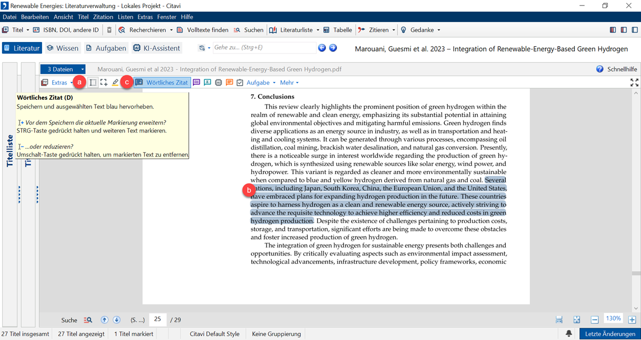 7 Um eine Aussage später wörtlich zitieren zu können, markieren Sie mit dem a Textauswahl-Werkzeug die gewünschte b Passage. Wählen Sie den Befehl c Wörtliches Zitat.