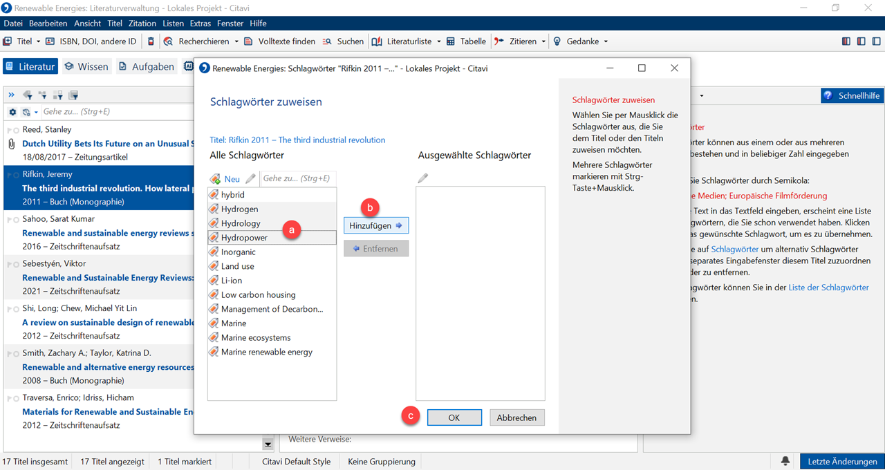 4 Markieren Sie a links das gewünschte Schlagwort (oder mehrere). Klicken Sie auf b Hinzufügen. Schließen Sie das Fenster durch Klick auf c OK.