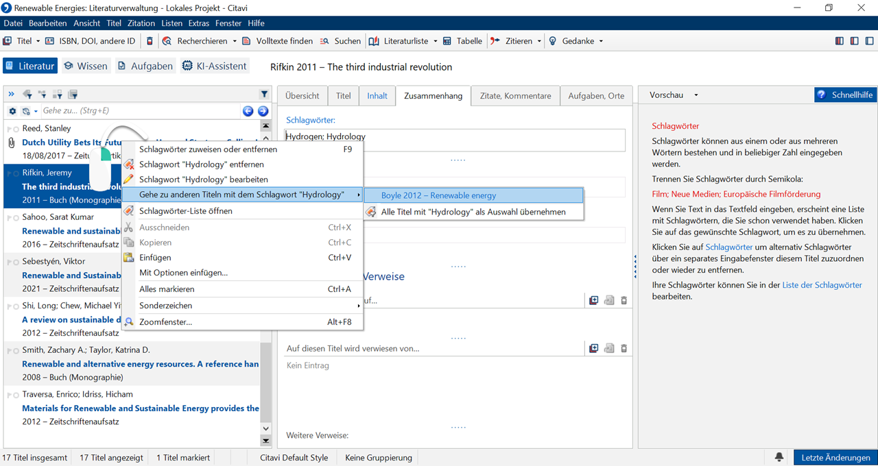 5 Wenn Sie mit der rechten Maustaste auf ein Schlagwort klicken, sehen Sie, welche anderen Titel mit demselben Schlagwort versehen sind.