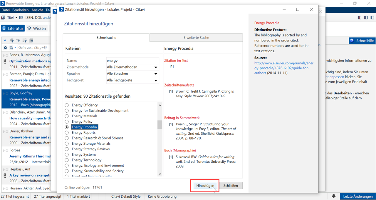 3 Geben Sie den Namen des Stils im Feld Name ein. Klicken Sie auf Hinzufügen. Wenn Sie den Namen eines Zitationsstil nicht kennen, können Sie einen passenden Stil über die Erweiterte Suche finden.