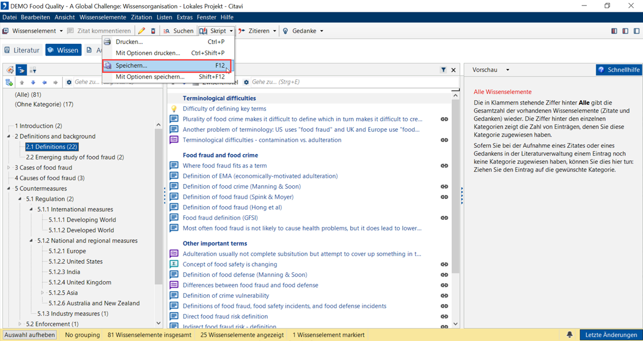 3 Möchten Sie nur ein Kapitel drucken? Markieren Sie die Kategorie, deren Wissenselemente Sie ausgeben wollen. Wählen Sie unter Skript > Speichern den Befehl Mit Optionen speichern. Wählen Sie den gewünschten Umfang des Skripts.