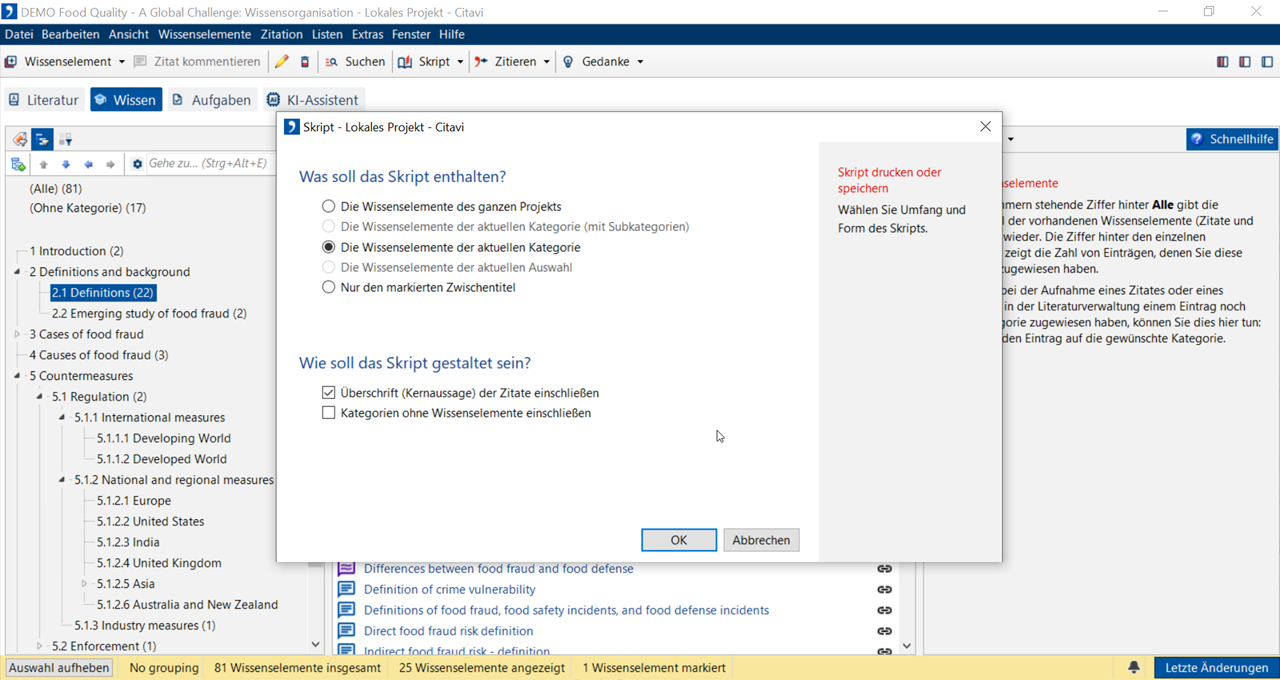 Nutzen Sie die Funktion Citavi Skript nicht, um ein Dokument für eine Publikation vorzubereiten. Wenn Sie alle Kategorien und Wissenselemente in Word übernehmen möchten, greifen Sie stattdessen auf die entsprechende Funktion von Citavis Word Add-In zurück.