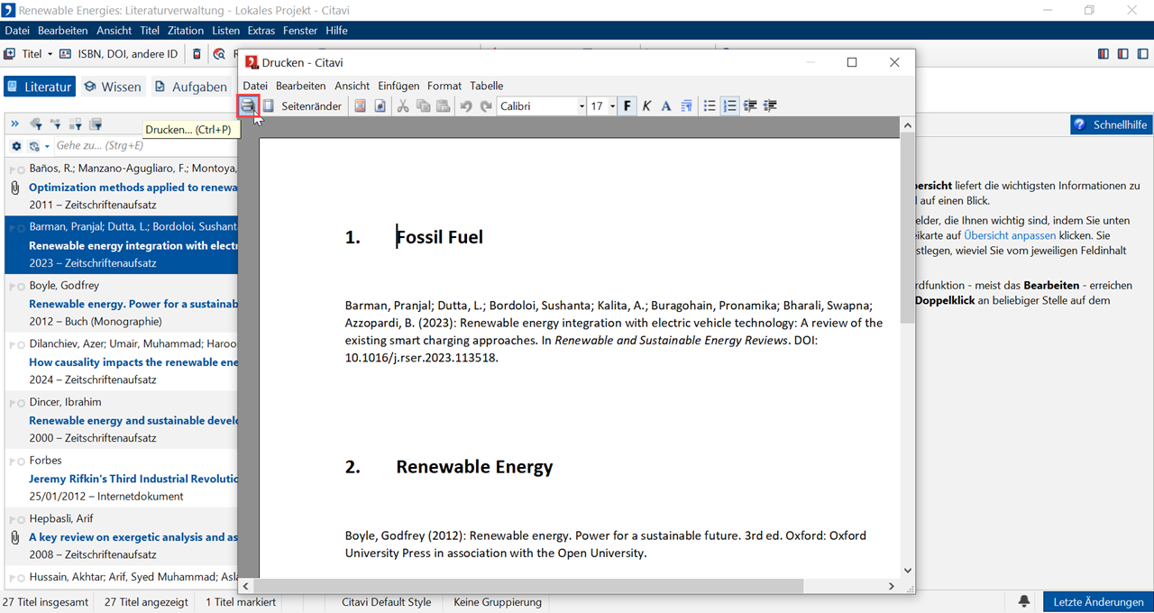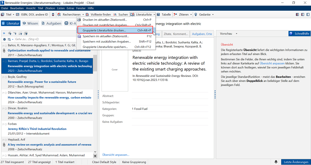 1 Wechseln Sie bei Bedarf den Zitationsstil. Klicken Sie auf Literaturliste und dann auf Gruppierte Literaturliste drucken.