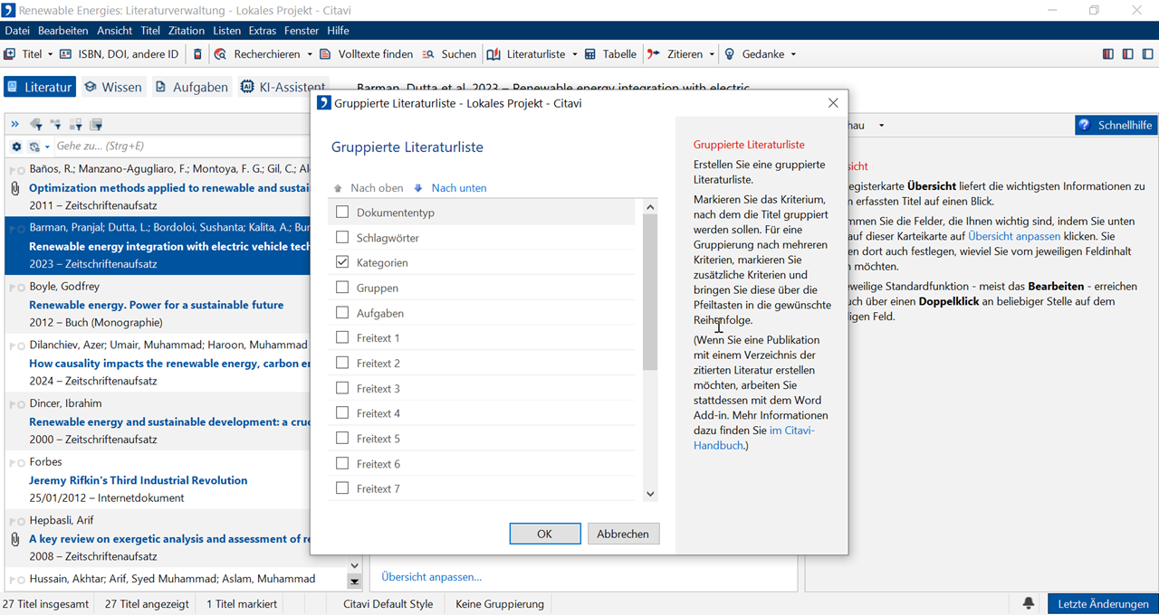 Sie möchten die gesammelte Literatur nicht nur alphabetisch sortieren, sondern auch gruppieren. Die Gruppierung kann beispielsweise nach Schlagwörtern erfolgen oder nach Jahr.