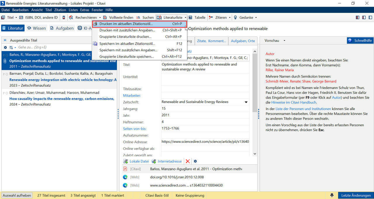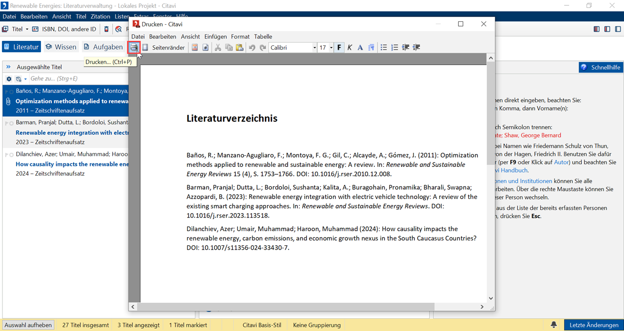 1 Wenn Sie nicht alle Titel in Ihrem Projekt in die Liste aufnehmen wollen, erzeugen Sie zuerst eine Auswahl. Wechseln Sie bei Bedarf den Zitationsstil. Wechseln Sie zur Literaturverwaltung. Klicken Sie auf Literaturliste. Wählen Sie, ob Sie die Liste direkt drucken oder als Datei speichern möchten.