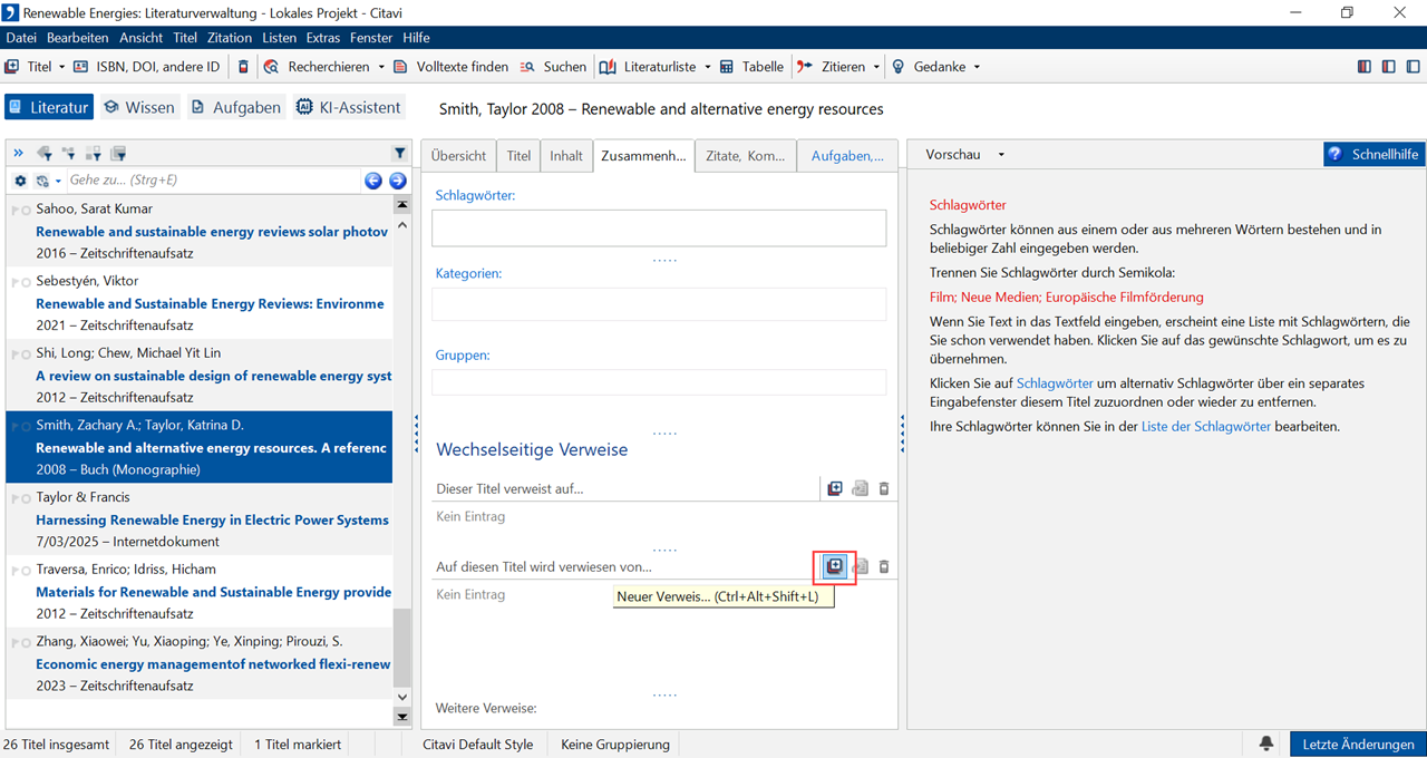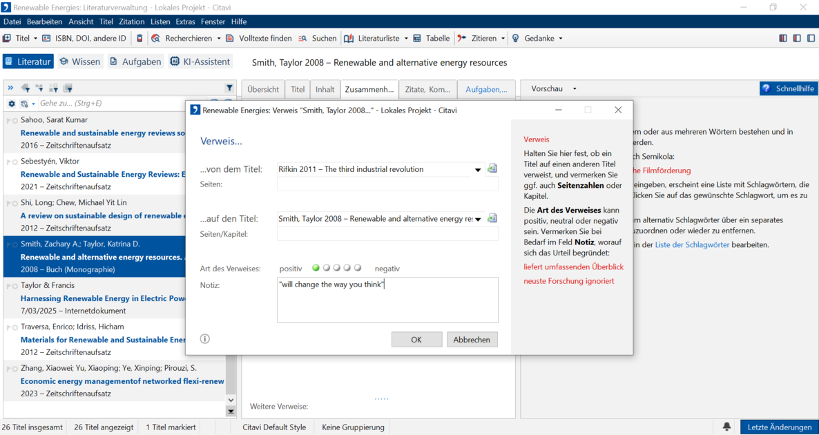 Welcher Autor bezieht sich in seinen Ausführungen auf welchen anderen Autoren – und wie bewertet er dabei die Vorarbeiten des anderen? Wenn Sie die Entwicklung eines Themas über einen längeren Zeitraum verfolgen möchten, kann es hilfreich sein, solche Verweise in Citavi zu dokumentieren.