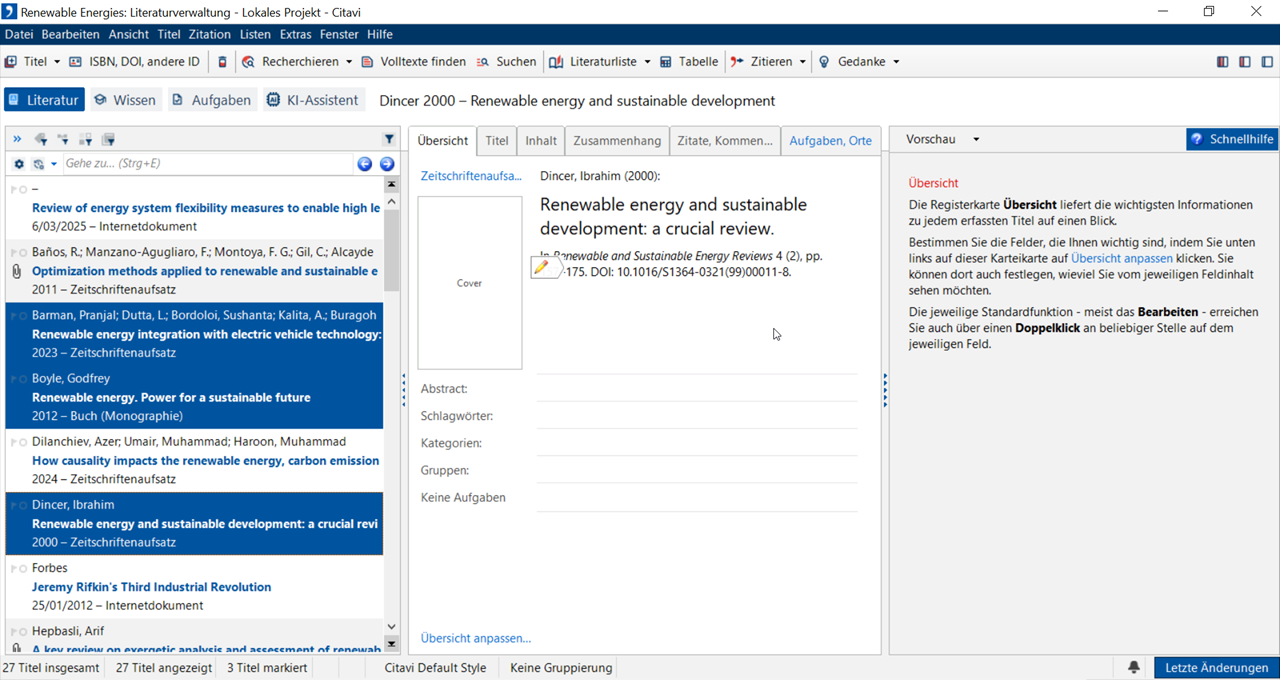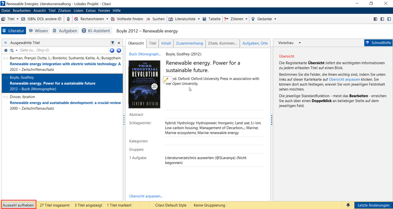 Eine Auswahl ist eine Teilmenge von Titeln in Ihrem Projekt. Eine Auswahl erzeugt Citavi automatisch, z. B. nach einer Recherche oder einem Import, damit Sie die Neuzugänge prüfen können. Eine Auswahl können Sie auch manuell erzeugen, um z. B. bestimmte Titel in ein anderes Projekt zu kopieren.