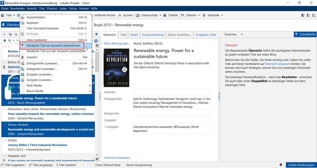 2 Klicken Sie mit der rechten Maustaste auf einen der markierten Titel. Wählen Sie Markierte Titel als Auswahl übernehmen.