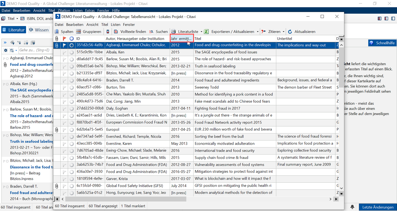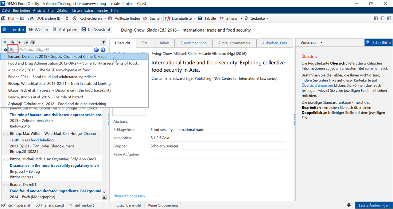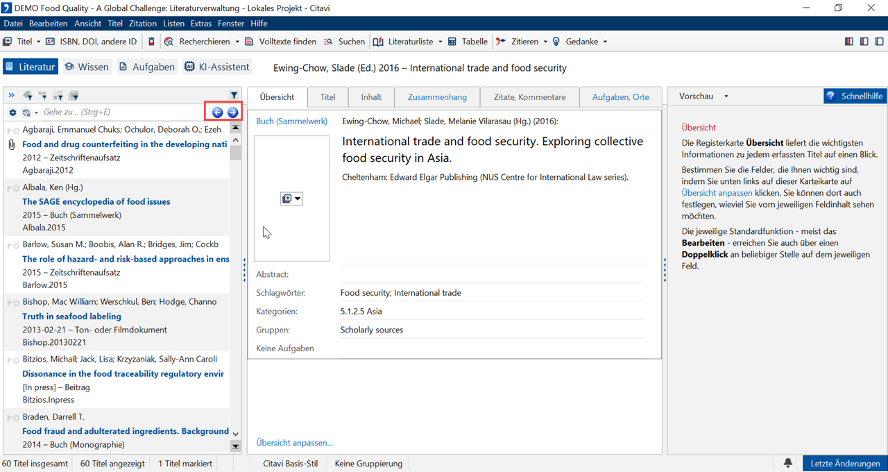 Um zwischen der Literatur in Ihrem Projekt hin- und herzuwechseln, stehen Ihnen verschiedene Verfahren zur Verfügung: Blättern Sie von Titel zu Titel. Nutzen Sie die Historien-Funktion, um zurückzublättern. Oder springen Sie über die Gehe-zu-Funktion direkt zu einem bestimmten Titel.