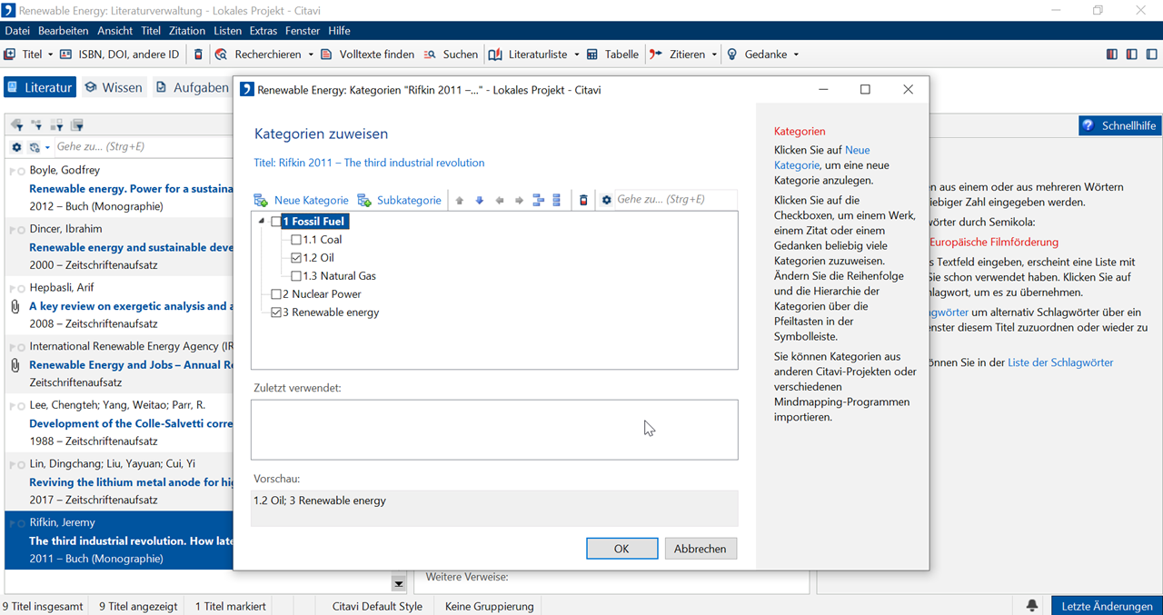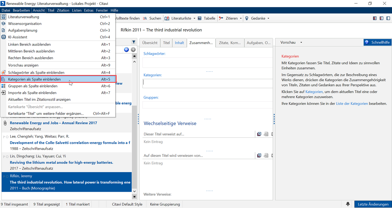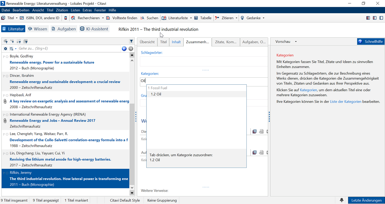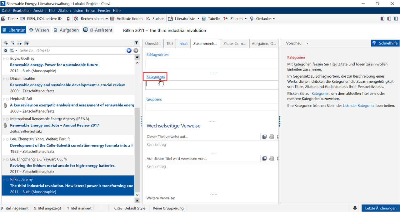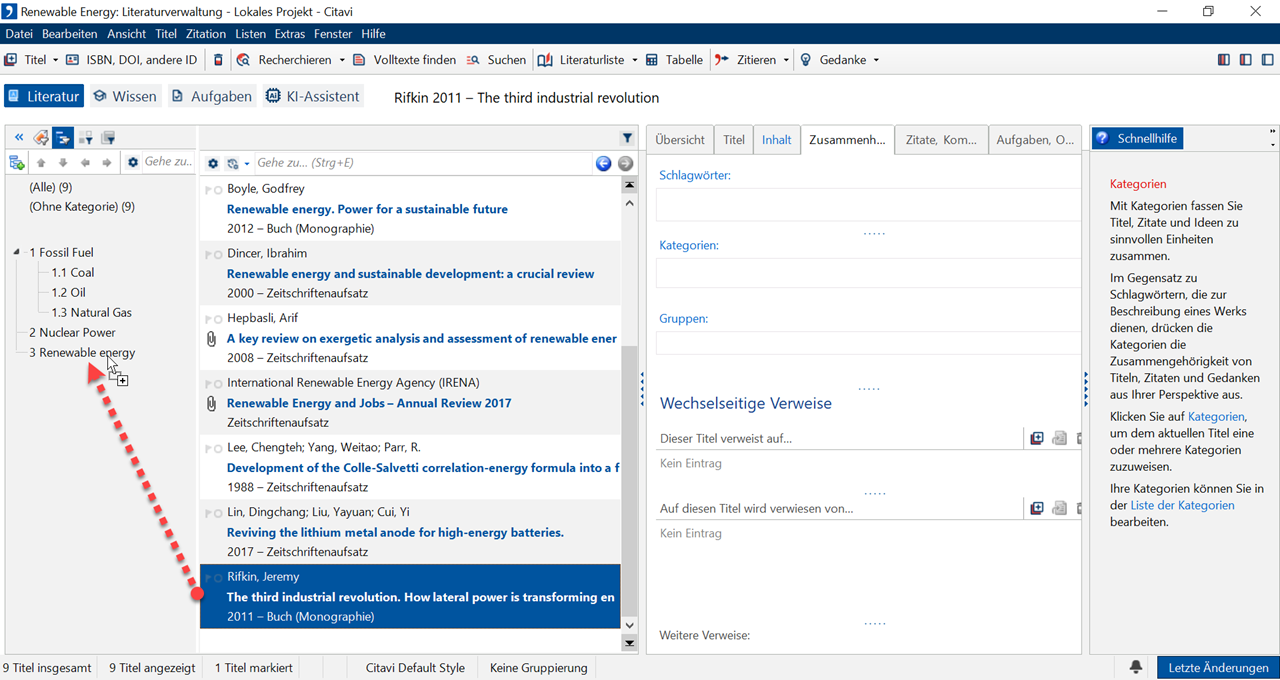 Sie können jeden Titel einer oder mehreren Kategorien zuordnen, um Ihre Literatur thematisch zusammenzufassen. Dafür stehen Ihnen mehrere Wege zur Verfügung.