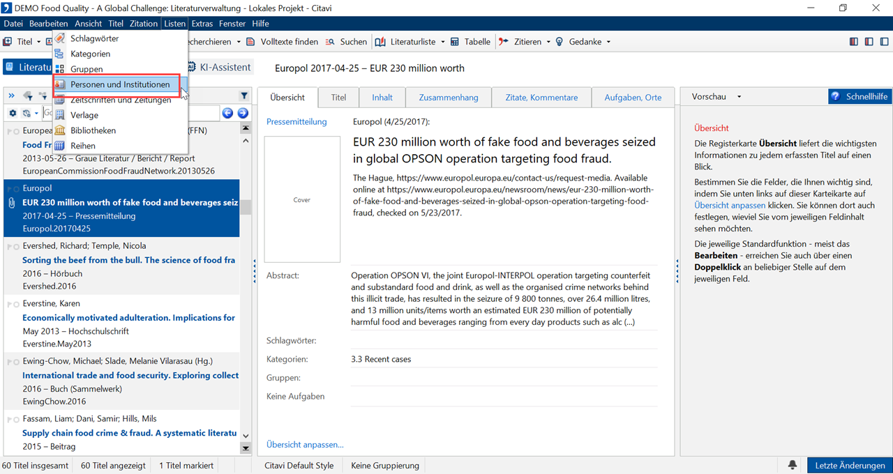 1 Wählen Sie aus dem Menü Listen den Eintrag Personen und Institutionen.