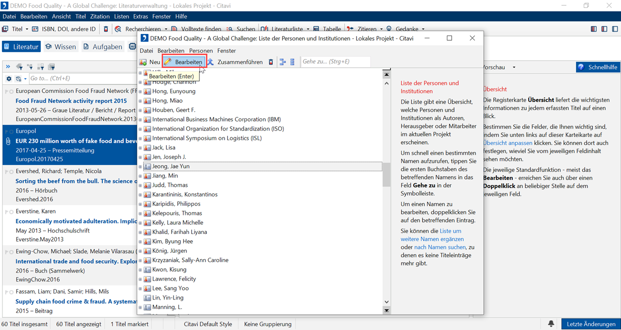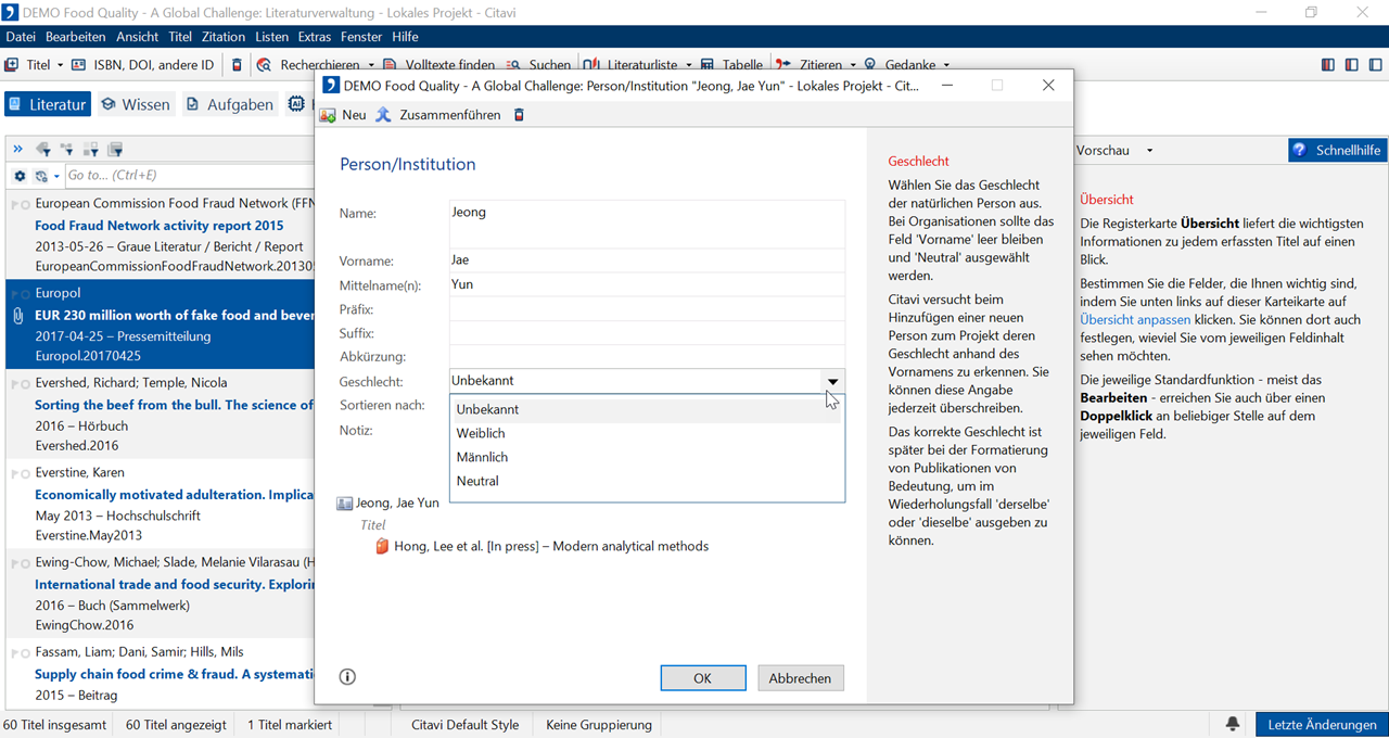 Citavi versucht, das Geschlecht anhand der Vornamen automatisch zu bestimmen (Internetverbindung erforderlich). Das Merkmal Geschlecht ist für einige Zitationsstile von Relevanz, die anstelle einer wiederholten Namensnennung das Pronomen ders. oder dies. erwarten.