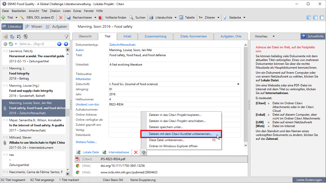 1 Klicken Sie auf das Zahnrad-Symbol oberhalb der verknüpften Datei. Wählen Sie Dateien mit dem Citavi-Kurztitel umbenennen.