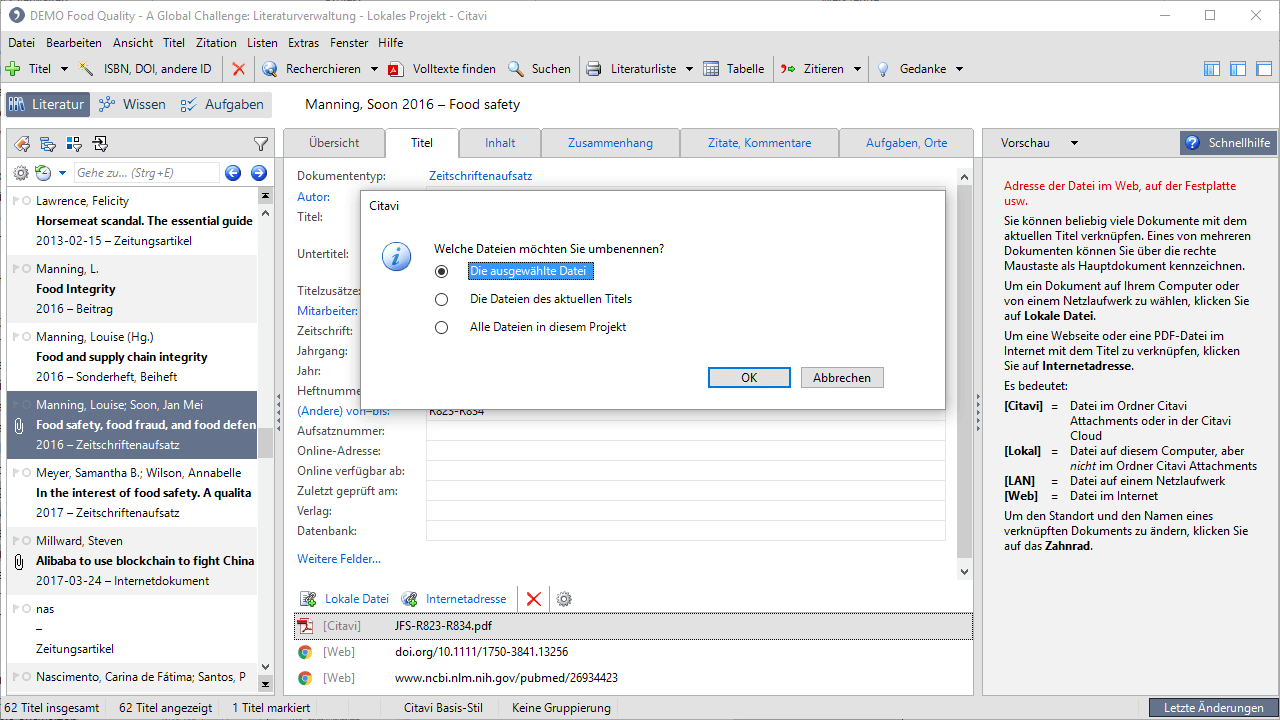 Sie können bei einer bereits verknüpften PDF-Datei wählen, ob der alte Name der PDF-Datei durch den von Citavi gebildeten Kurztitel ersetzt wird. Dabei können Sie entscheiden, ob die Umbenennung nur für die gerade ausgewählte Datei oder für alle Dateien in Ihrem Projekt gelten soll.