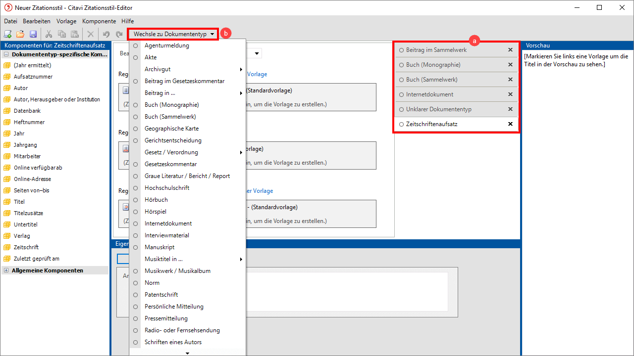 In Ihrem Citavi-Projekt finden sich unterschiedliche Dokumententypen: Zeitschriftenaufsätze, Monographien, Sammelwerke u. a. Im Zitationsstileditor legen Sie für jeden Typ die Darstellungsweisen fest, und zwar für die Darstellung im Literaturverzeichnis, in den Fußnoten oder im Text.