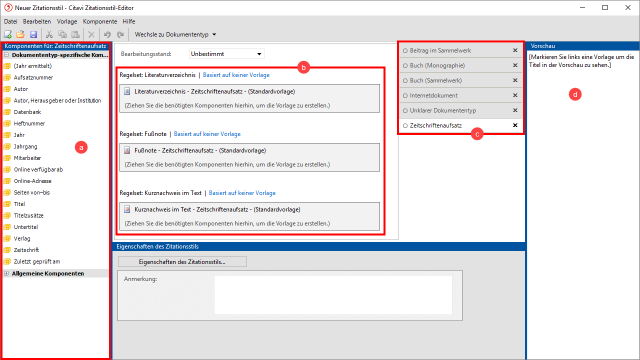 - Aus der a Komponentenpalette ziehen Sie Komponenten auf die b Montagefläche. Für jeden c Dokumententyp legen Sie fest, wie ein Titel im Literaturverzeichnis und ggf. in der Fußnote oder als Kurznachweis im Text erscheinen soll. Die Ergebnisse Ihrer Arbeit sehen Sie in der d Vorschau. Beachten Sie die Grundregeln für die Verwendung der Komponenten.