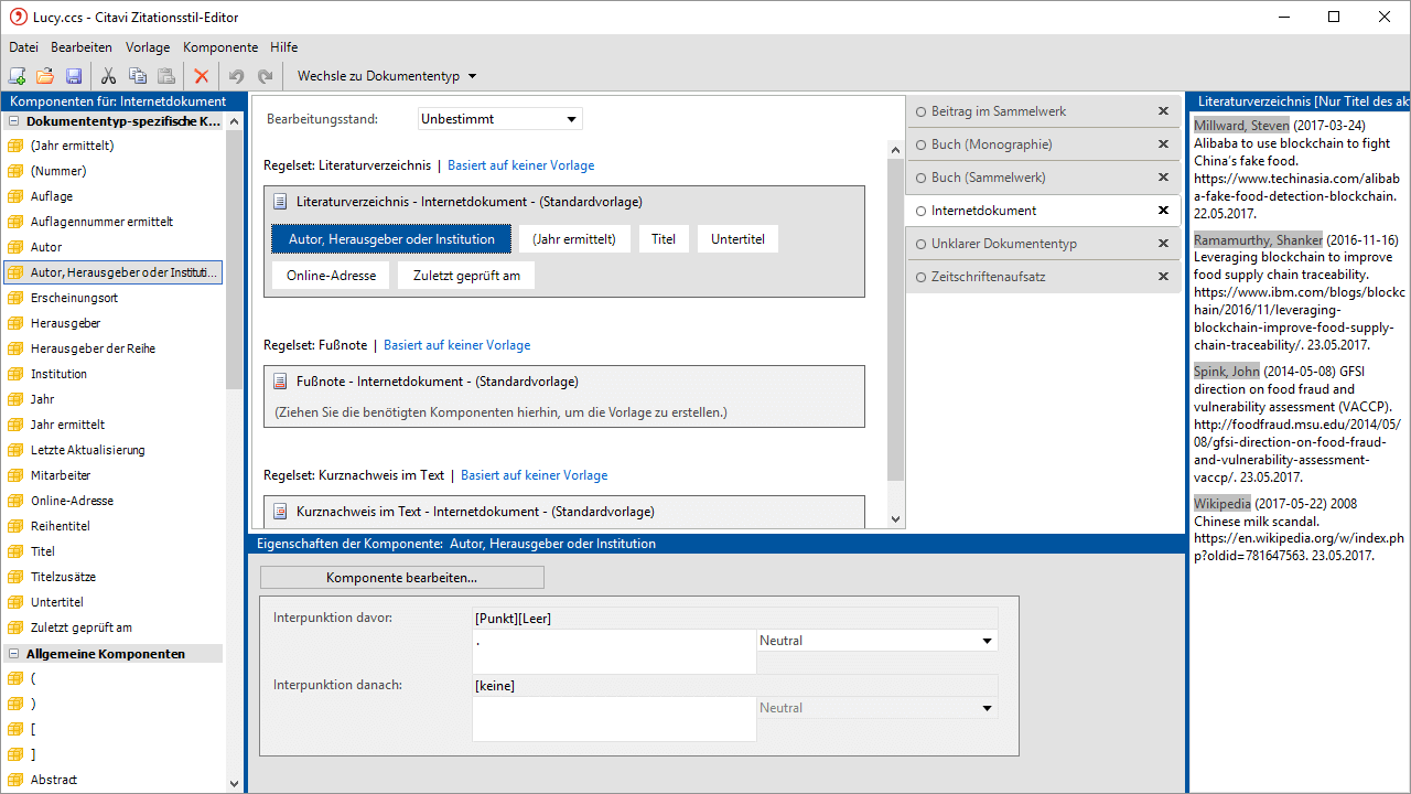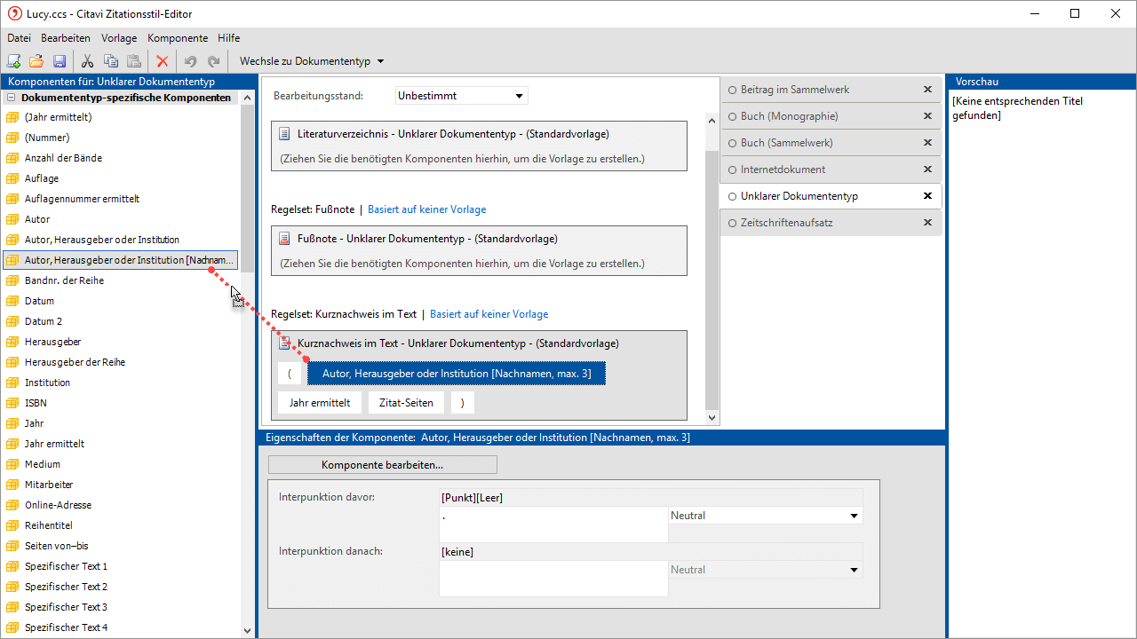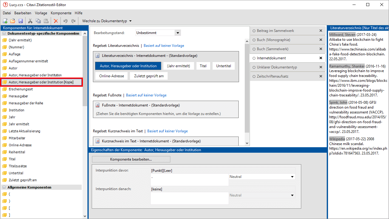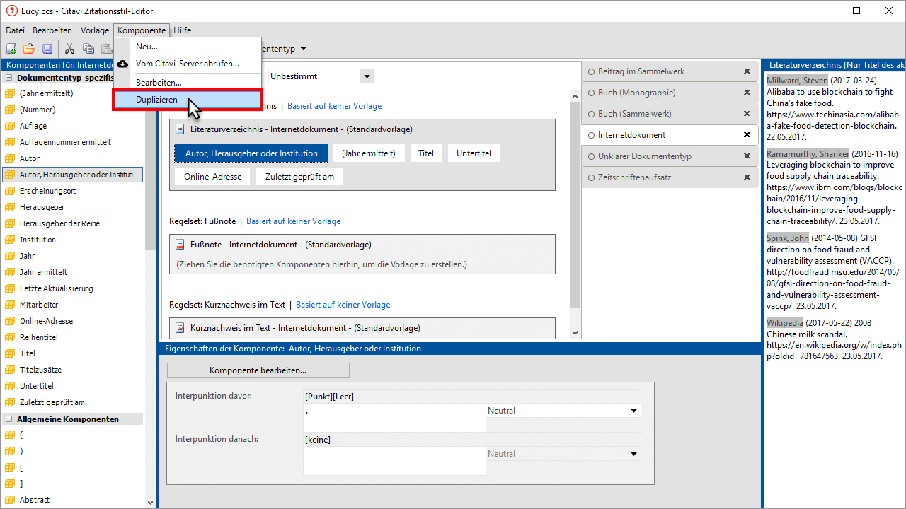 Citavi stellt für jeden Dokumententyp die passenden Komponenten zur Verfügung, z. B. Autor oder Verlag für Monographien. Sie werden diese Komponenten zuerst für die Darstellung im Literaturverzeichnis bearbeiten. Einige der Komponenten benötigen Sie auch an anderen Orten, z. B. für den Quellennachweis im Text. Hier soll sich die entsprechende Komponente anders verhalten. In solchen Fällen duplizieren Sie die entsprechende Komponente und passen das Duplikat Ihren Wünschen entsprechend an.