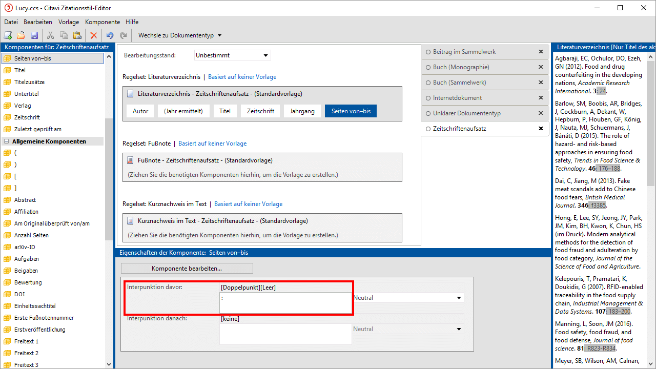 Beginnen Sie bei der letzten Komponente. Tragen Sie das gewünschte Zeichen und ggf. ein Leerzeichen in das Feld Interpunktion davor ein.