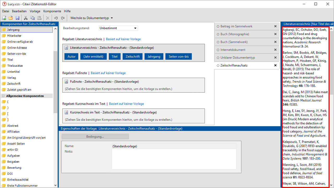 In das Feld Interpunktion danach tragen Sie das Satzzeichen ein, das den vollständigen Quellennachweis abschließen soll. Das ist meistens ein Punkt. Wenn Sie sicherstellen möchten, dass ein Vollbeleg in der Fußnote nicht mit einem Punkt enden soll, würden Sie bei allen Komponenten den Inhalt des Felds Interpunktion danach löschen.