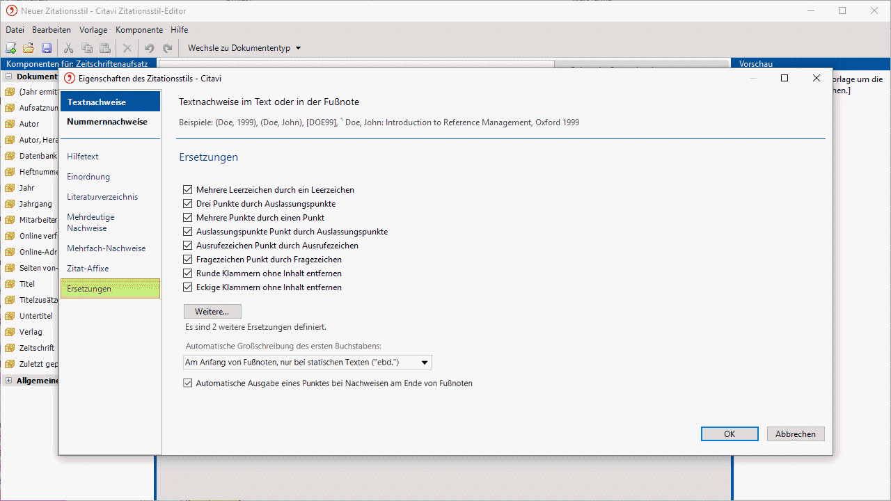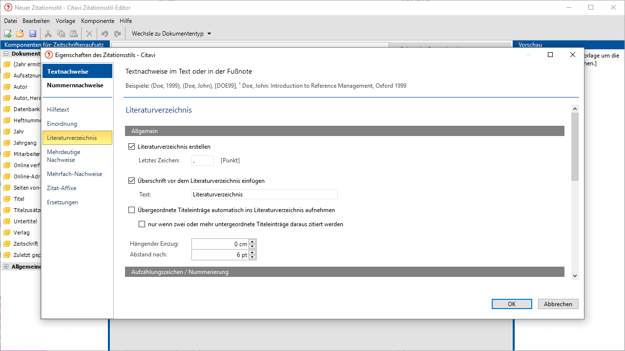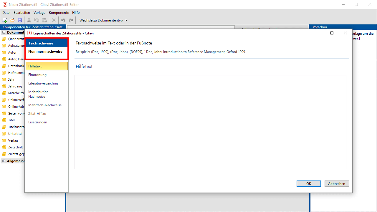 In den Eigenschaften des Zitationsstils definieren Sie die gesamte Erscheinungsform des Literaturverzeichnisses. Drei Grundformen stehen zur Auswahl: Referenznummern, Kurznachweis im Text und Vollbeleg in der Fußnote. Abhängig von der gewählten Grundform definieren Sie unterschiedliche Eigenschaften.