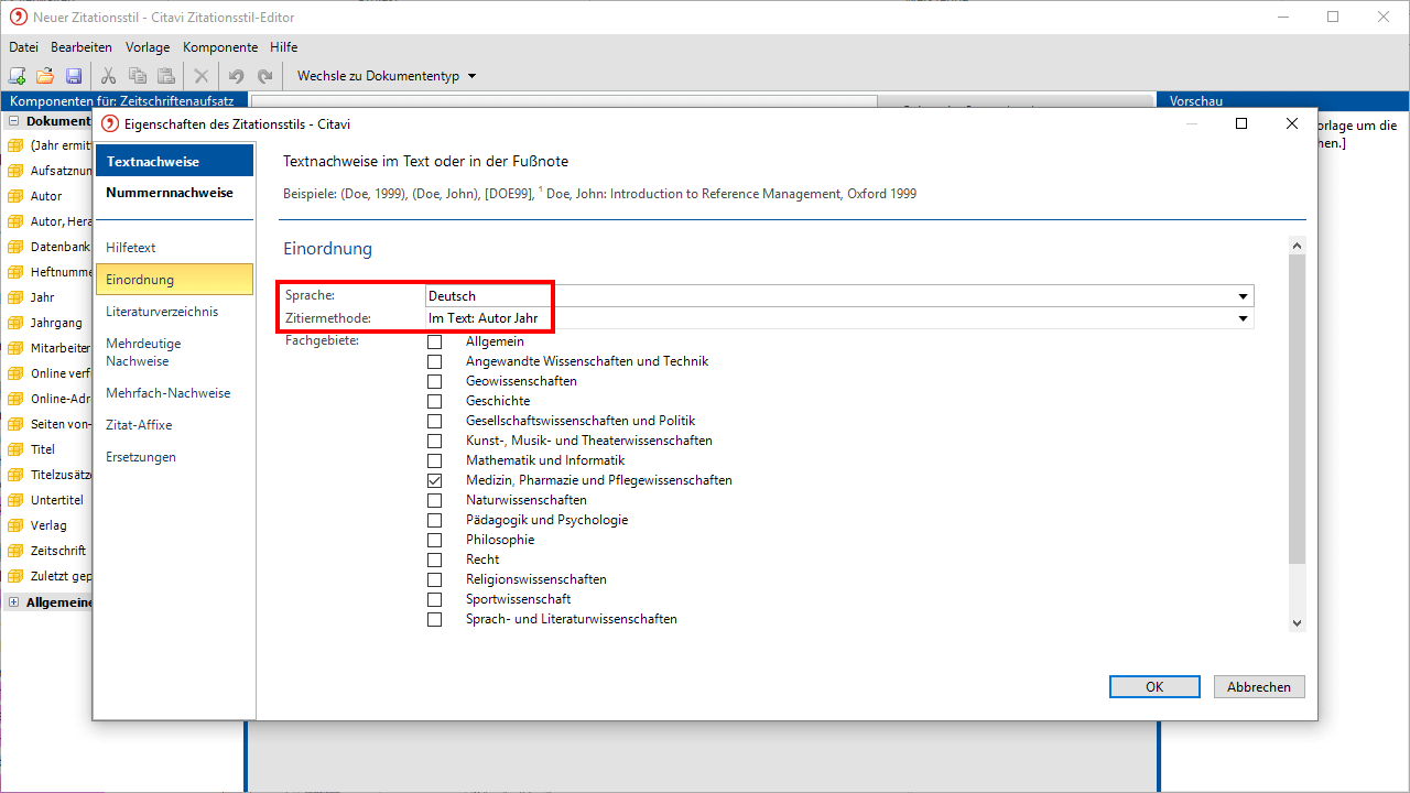 Optional: Wählen Sie, in welchen Fachgebieten der Stil zum Einsatz kommt.