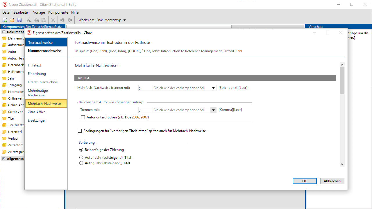 6 Nur für Referenznummern- und Autor-Jahr-Stile: Häufiger werden Sie eine Aussage durch mehrere Quellen belegen wollen. Legen Sie hier fest, mit welcher Interpunktion die Quellen voneinander getrennt und in welcher Reihenfolge sie erscheinen sollen.