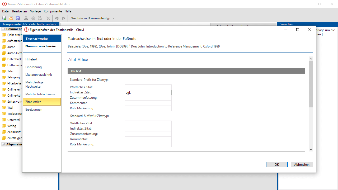 7 Optional: Legen Sie fest, ob der Stil bestimmte Zitat-Typen automatisch um Text ergänzen soll (z. B. indirekten Zitaten das Wort »vgl.« voranstellen; vergessen Sie nicht, ein Leerzeichen hinter das Wort einzugeben).