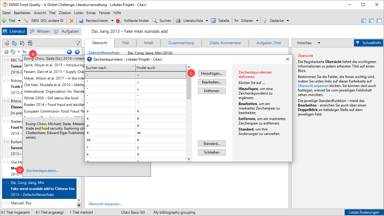 Mit Hilfe der Funktion Zeichenäquivalenz können Sie Citavi anweisen, bestimmte Zeichen auch dann bei der Suche zu berücksichtigen, wenn sie in einer anderen Form gespeichert sind. Suchen Sie beispielsweise nach dem Autor Aßländer, können Sie Citavi anweisen, auch die Schreibweise Assländer in die Suche einzubeziehen.