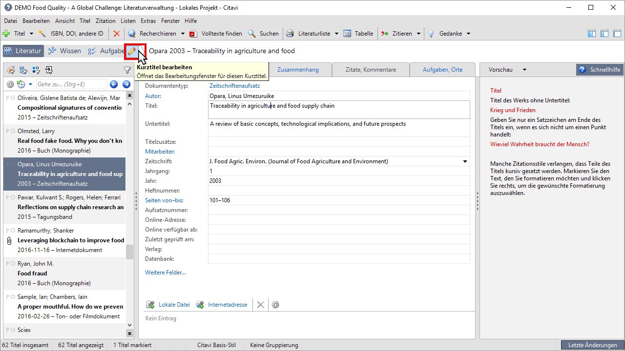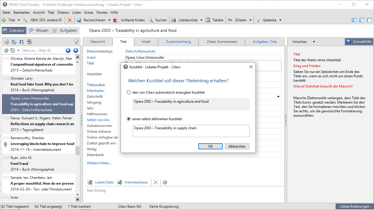 Der Kurztitel dient der Kennzeichnung eines Titels im Citavi-Projekt