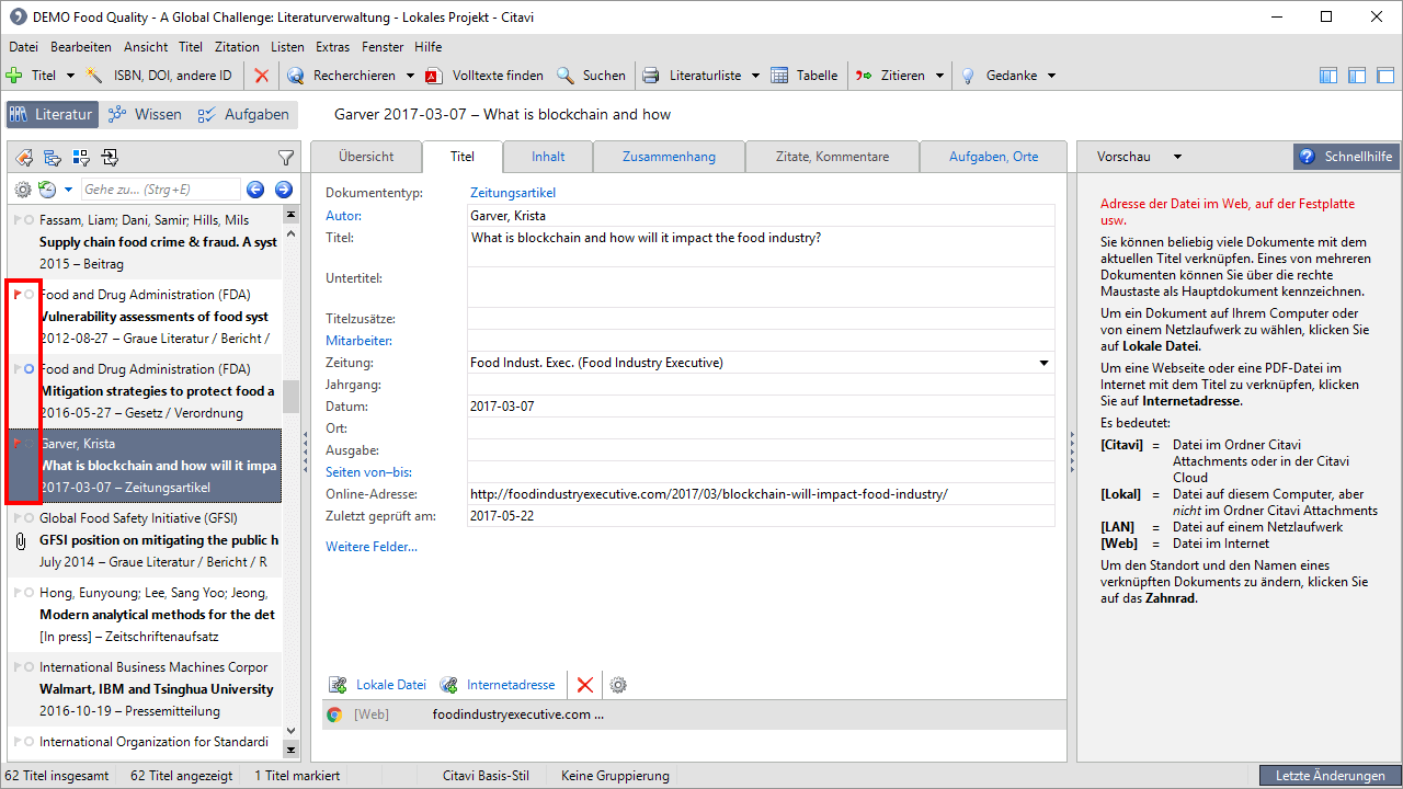 Sie können die Marken verwenden, um eine Auswahl vorzubereiten. Setzen Sie beispielsweise blaue Marken für alle Titel, die Sie ausgewertet haben.