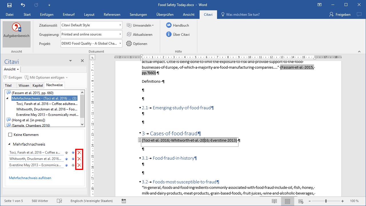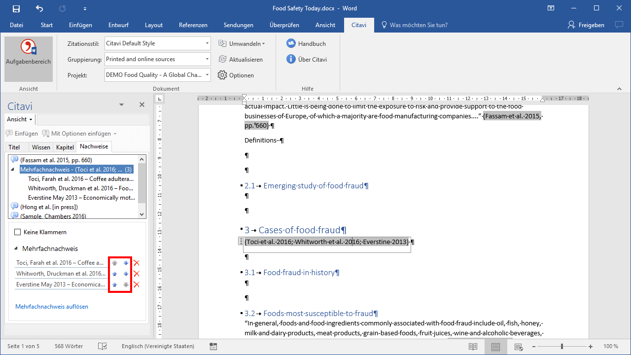 Der Zitationsstil bestimmt, in welcher Reihenfolge die Quellennachweise im Mehrfachweis erscheinen: unverändert (in der Reihenfolge, wie Sie diese zitieren), nach Datum der Veröffentlichung oder alphabetisch nach Personennamen sortiert.